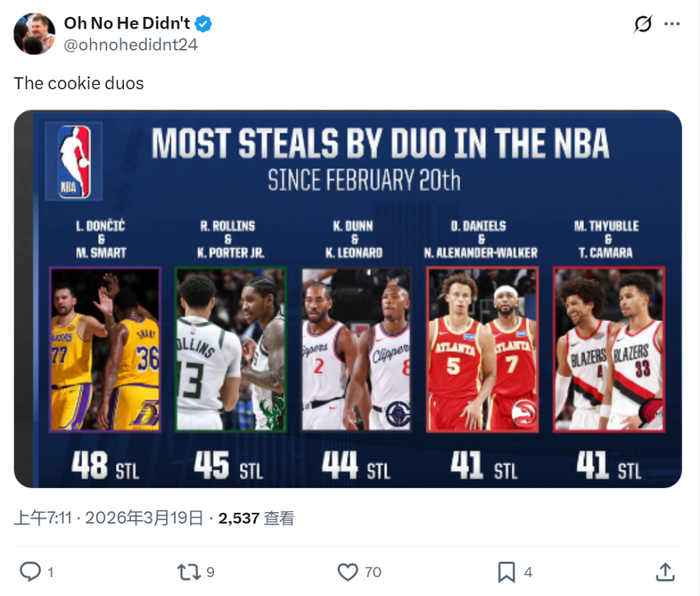 北京时间3月19日,美媒公布最新NBA抢断数据榜单,湖人队东契奇与斯玛特以48次抢断并列联盟第一,刷新近一个月二人组抢断纪录。数据显示这对组合在攻防两端的协同效应显著,其抢...