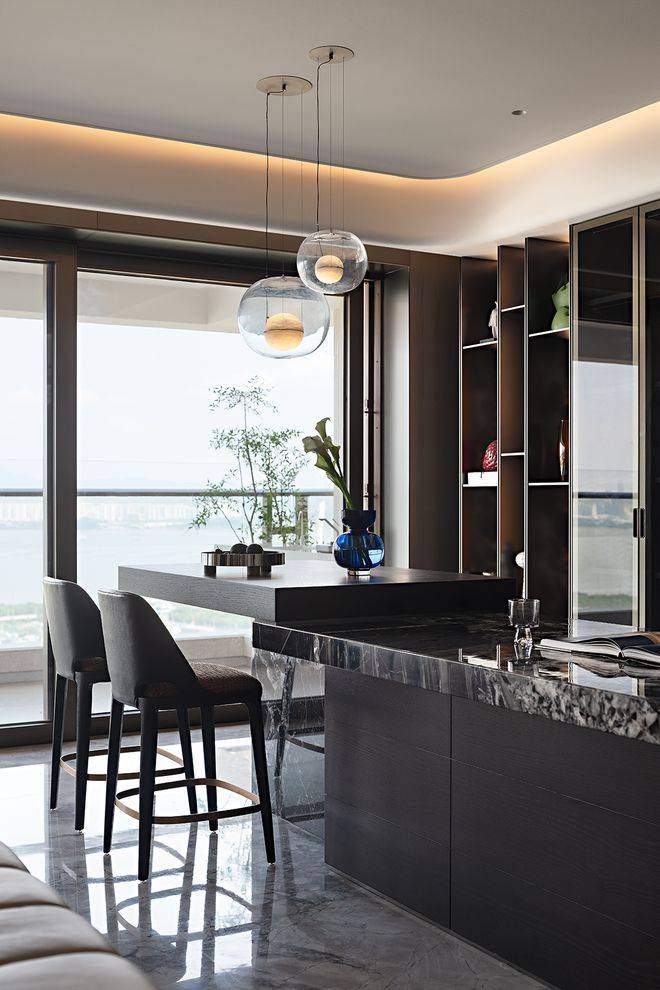 餐厅区域的设计独具匠心。设计师巧妙利用转角空间,通过木质餐椅与大理石地面的材质对话,营造出温馨的用餐氛围。区域尺度经过精确计算,既保证了使用的舒适性,又维持了整体的开放感。