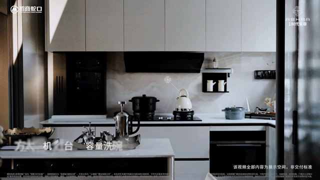招商时代乐章艺术化的再造传统餐厨空间,可开可合的岛台设计,结合艺术玻璃移门,在提升空间灵动性的同时,也激发出餐厨空间生活的多样性。