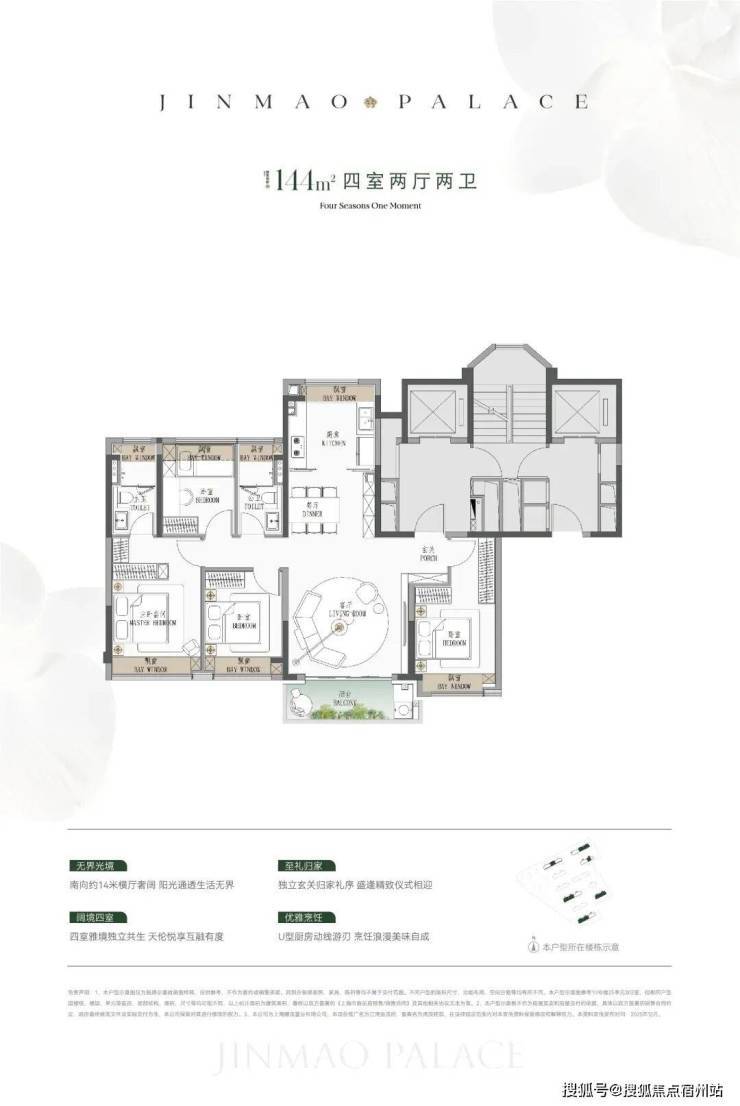 类一梯一户设计,电梯厅私密入户;四个房间,从小太阳到二胎家庭/三代同堂都能轻松托举全屋七飘窗,厨房、卫生间、卧室都有,总面积超过9.9㎡,实用性拉满!建面约190㎡4房: